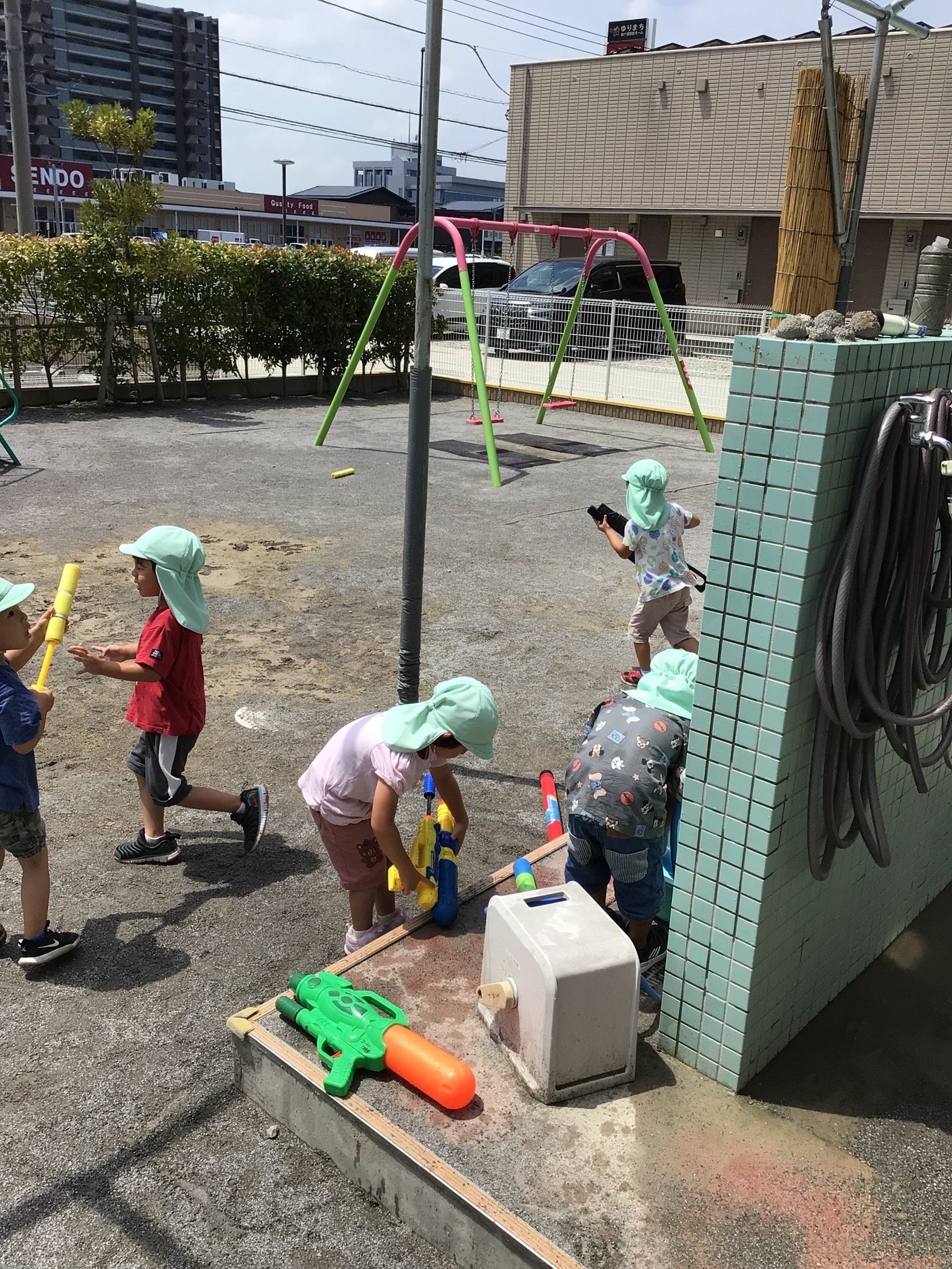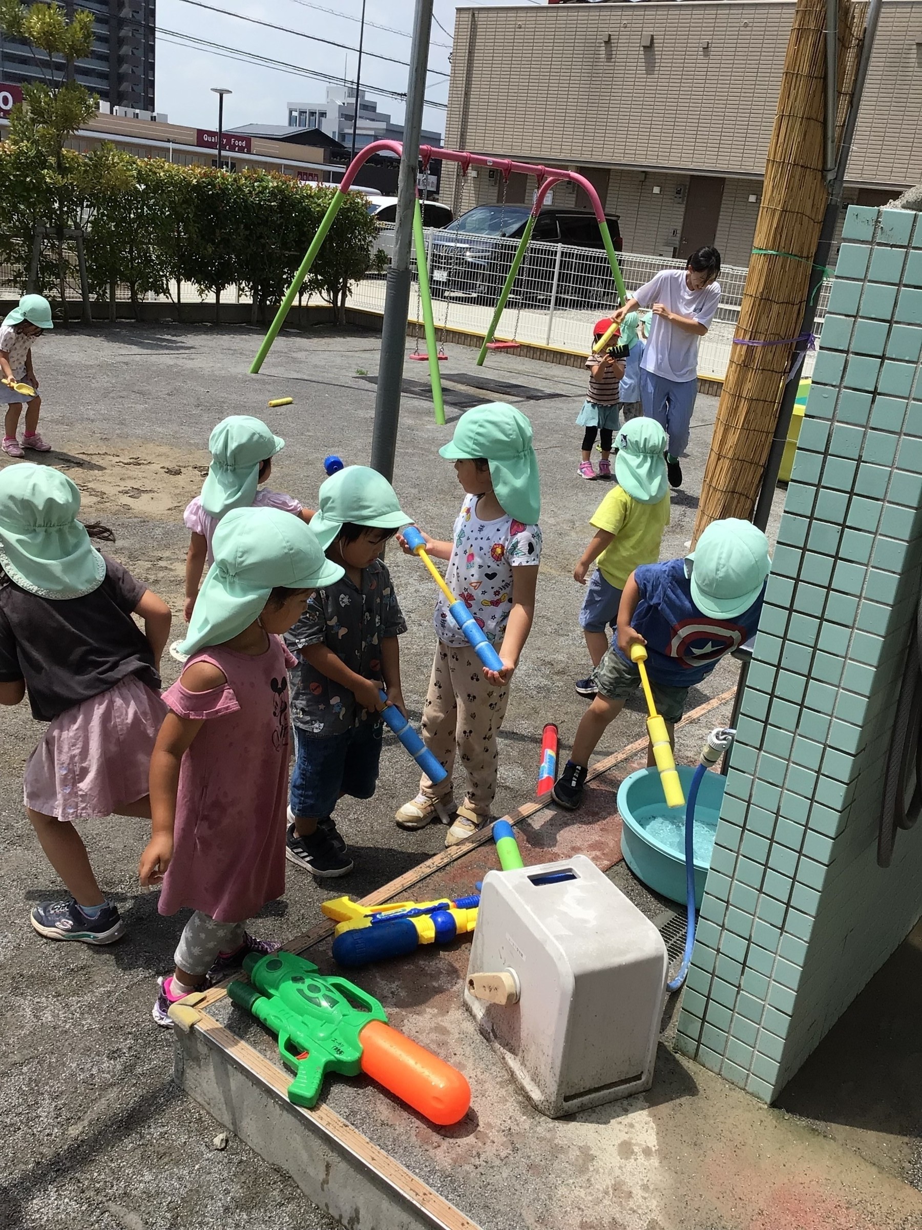 今日は、日よけが間に合わずプール遊びではなく、「水鉄砲合戦」に変更しましたぁ~!