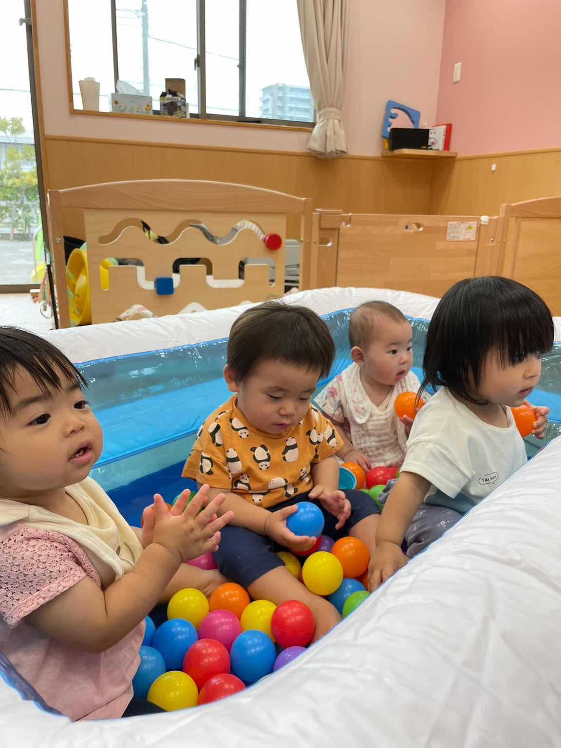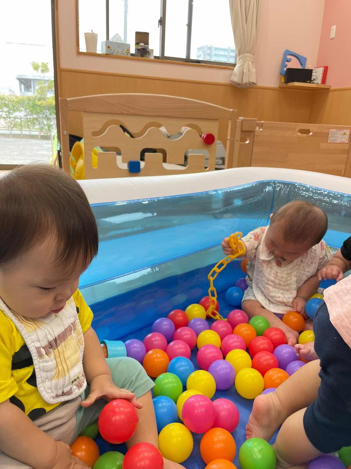 「ほほえみ組」さんは、お部屋にプールを出して、ボールをバシャァ~ン💦中に入ってバシャバシャ(^▽^)/