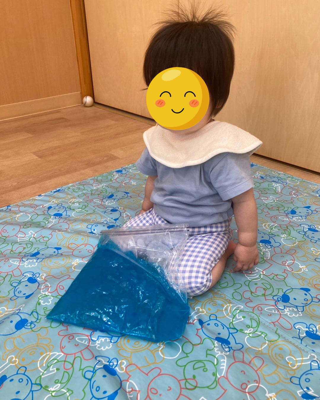 ジップロックの中に色をつけた寒天を入れ、もんでみたり、ひんやりとした感触を楽しんでみたり、夢中になってあそんでいました😊