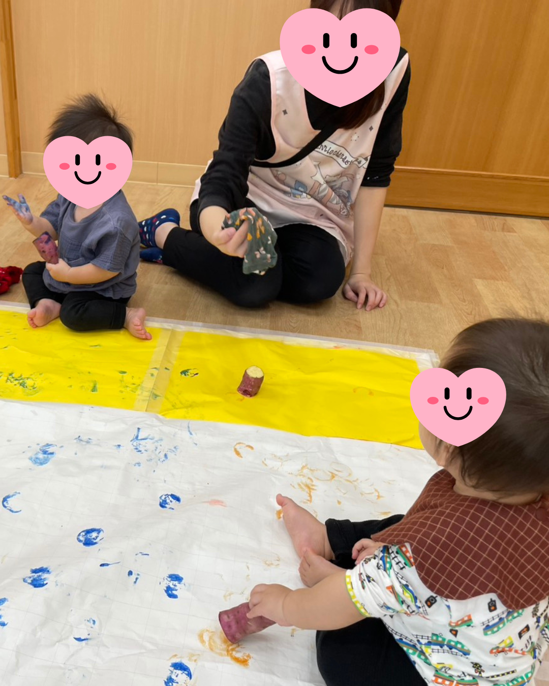 季節の野菜のさつまいもを使って、0歳児のおともだちでさつまいもスタンプを行いました!!