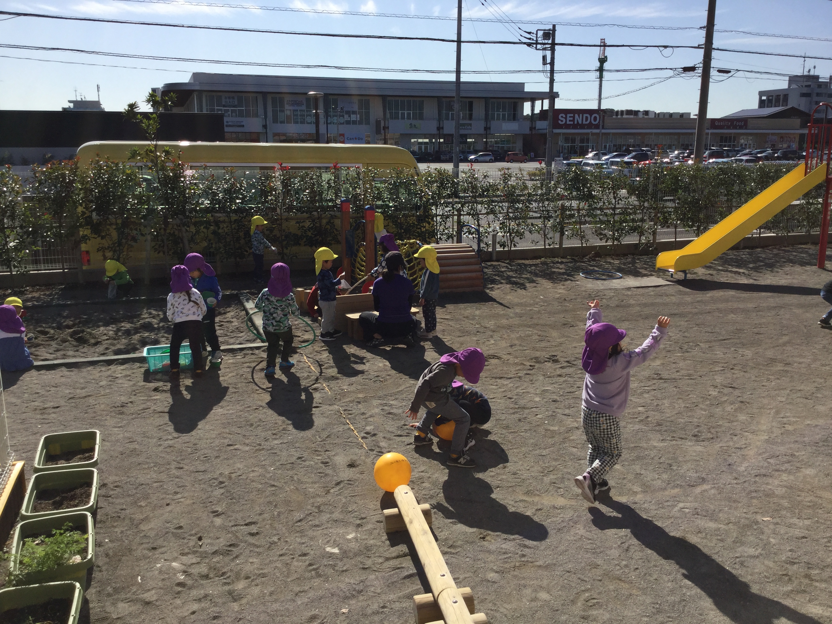 子ども達は、近所の公園までお散歩に出かけたり、園庭でたくさん走り回ったり